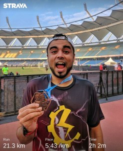 The course in Delhi is generally flat and the weather is great during that period so a lot of runners target to do their best in this race. My previous best was the Mumbai Half Marathon 2020 where I had run a 2:09:42 which was around 10mins faster than my previous timing. I didn’t have any specific target in my head but I definitely wanted to beat this time. I was pretty nervous a day before and was speaking to Krish about how to approach the race and he had told me that I should just keep faith in all the work I had put in and start smart and then pick up in the latter part of the race.